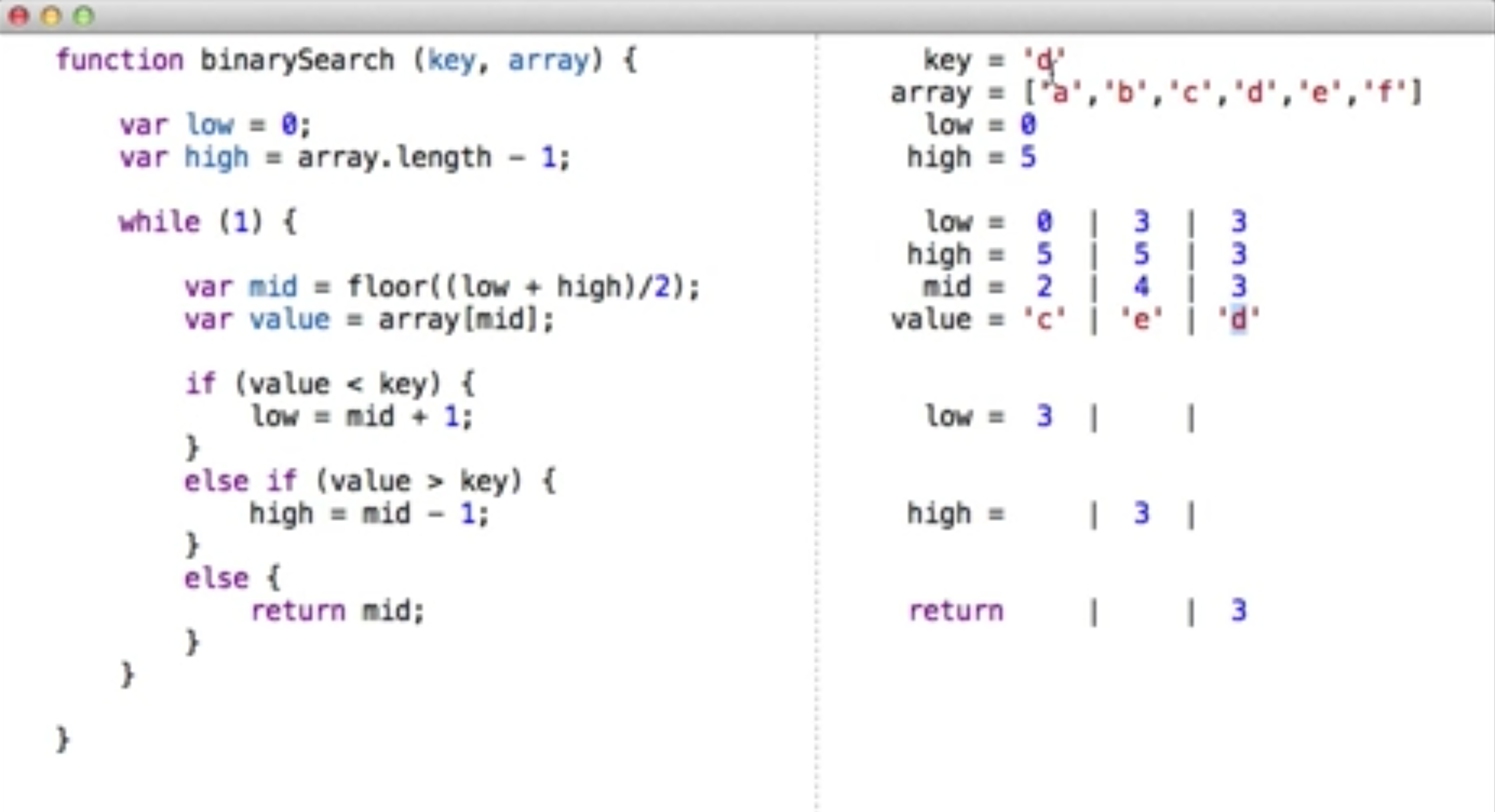 2020-12-16: Trying to implement Bret's binary search example from "Inventing On Principle" in a live-updating postfix environment.